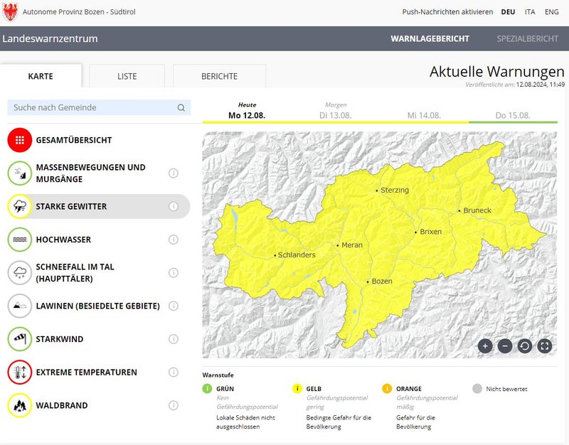 - Für heute werden starke Gewitter erwartet, deshalb scheint im Warnlagebericht vom Montag, 12. August, in ganz Südtirol die Warnstufe Gelb auf. (Foto: Warnlagebericht des Landeswarnzentrums in der Agentur für Bevölkerungsschutz) » [IMG 155 kB]