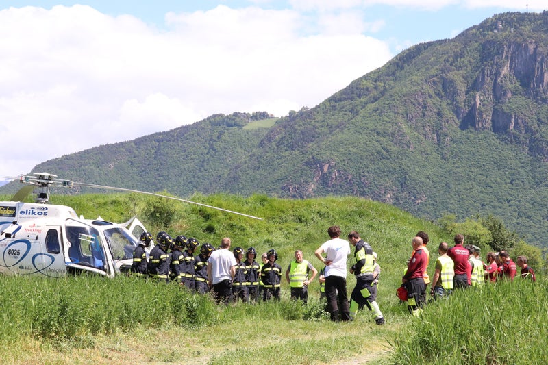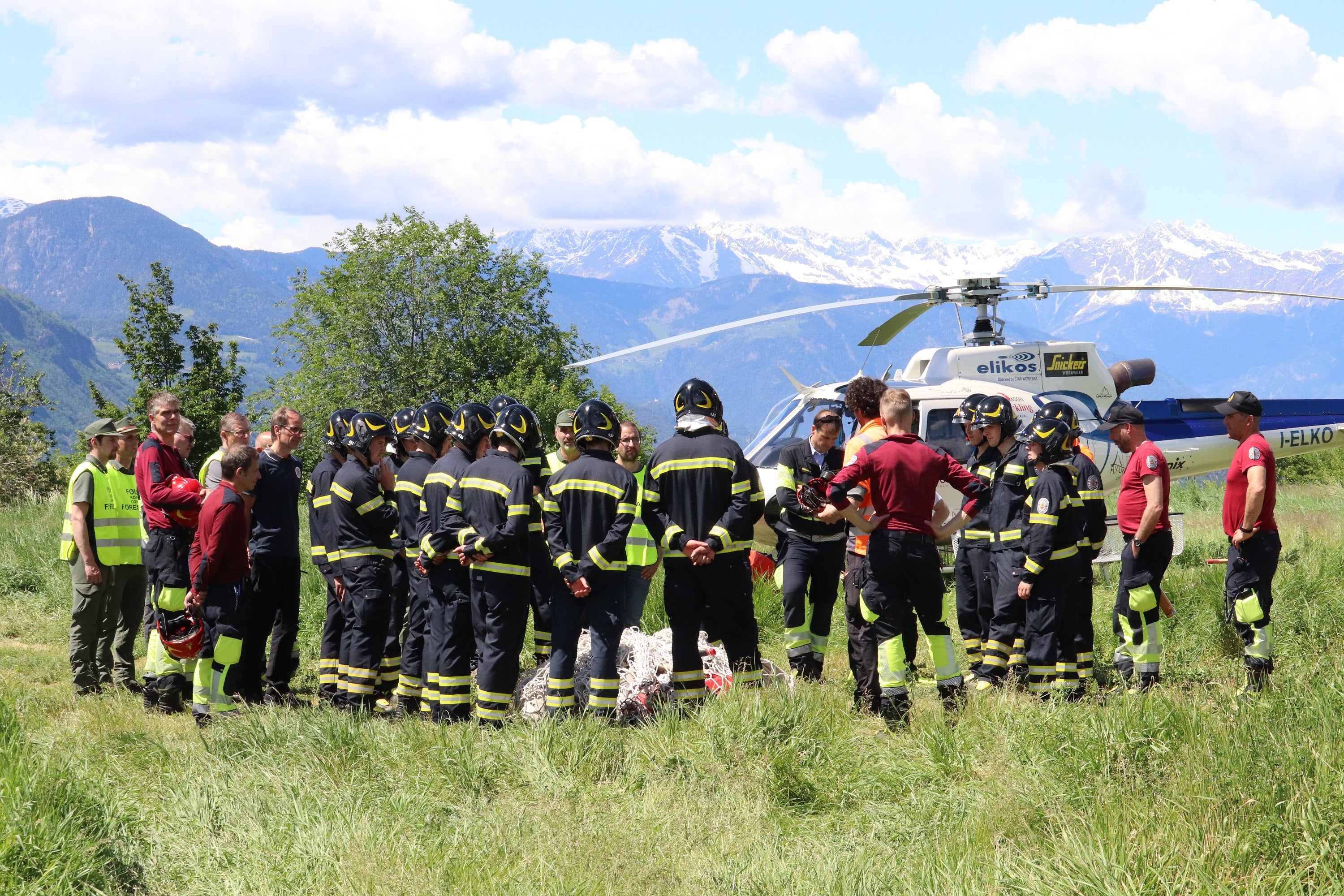 Der Löschhubschrauber holt Wasser aus der Etsch und fliegt die mobilen Speicherbecken zur Zwischenlagerung an: Beim Erlernen der Bekämpfung eines simulierten Waldbrandes vom Boden und von der Luft aus sind alle mit großem Einsatz dabei.