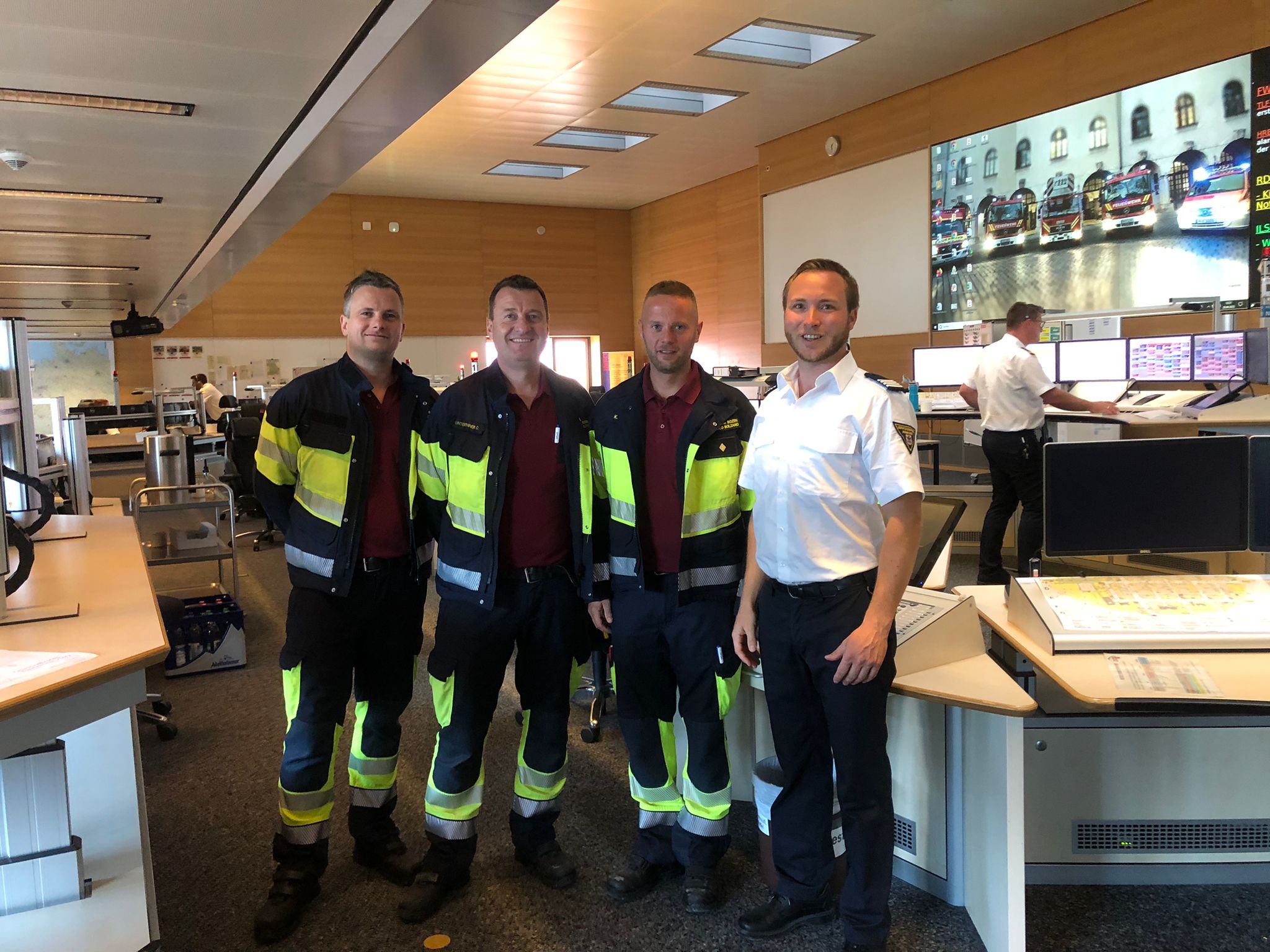 - Hilfeleistung durch Dolmetscherdienst (v.l.) Michael Hofer, Christian Unterthiner und Thomas Keim von der Berufsfeuerwehr Bozen und der zuständige Feuerwehrbeamte der Berufsfeuerwehr München Julian Milberg. (Foto: LPA/Berufsfeuerwehr Bozen) » [IMG 407 kB]