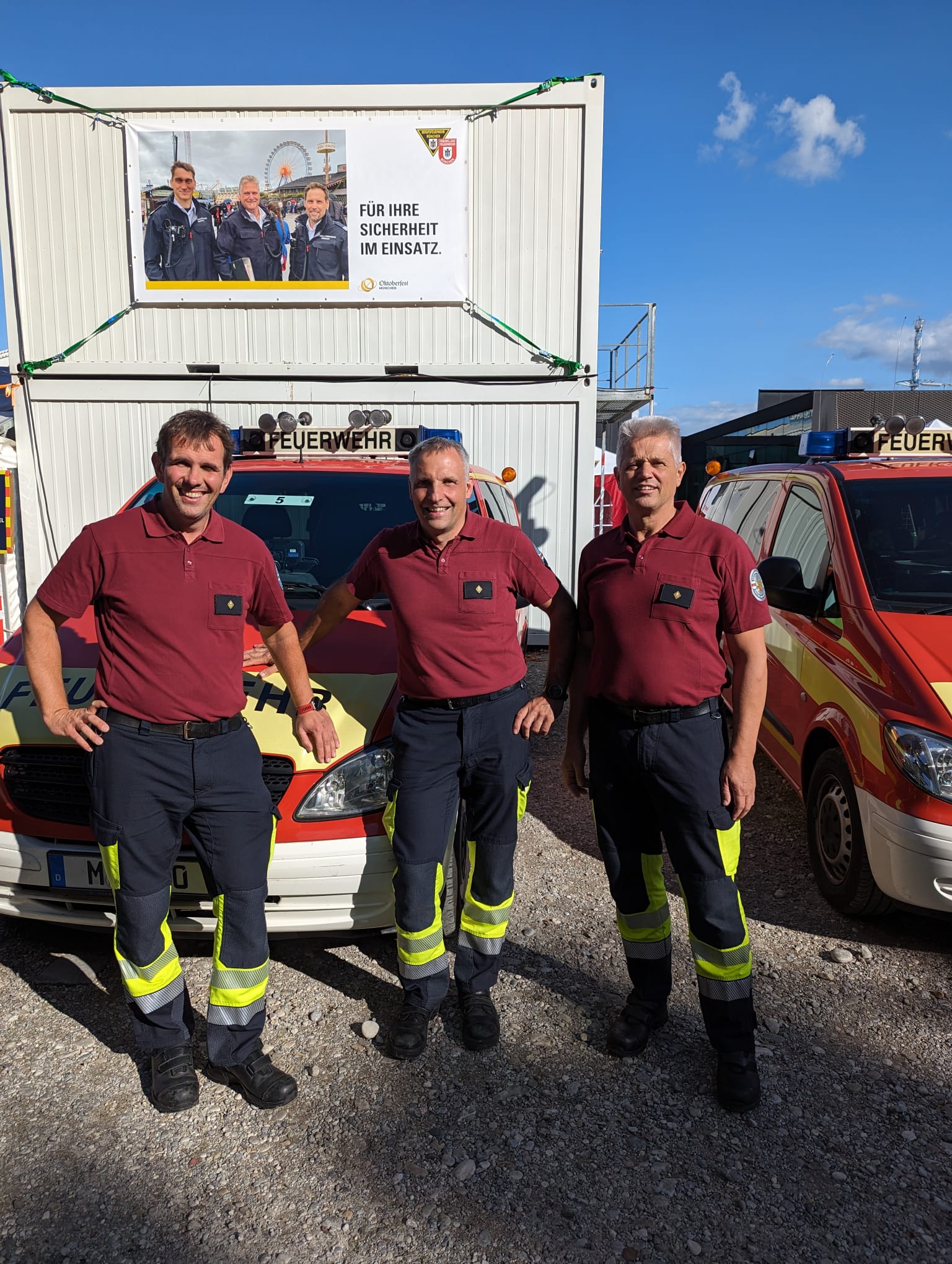 - "Für Ihre Sicherheit im Einsatz": Die Bozner Berufsfeuerwehrmänner Markus Fill, Stefan Tischler und Georg Schöpf (von links) haben beim diesjährigen Oktoberfest die Münchner Kollegen ergänzt. (Foto: LPA/Berufsfeuerwehr Bozen) » [IMG 499 kB]