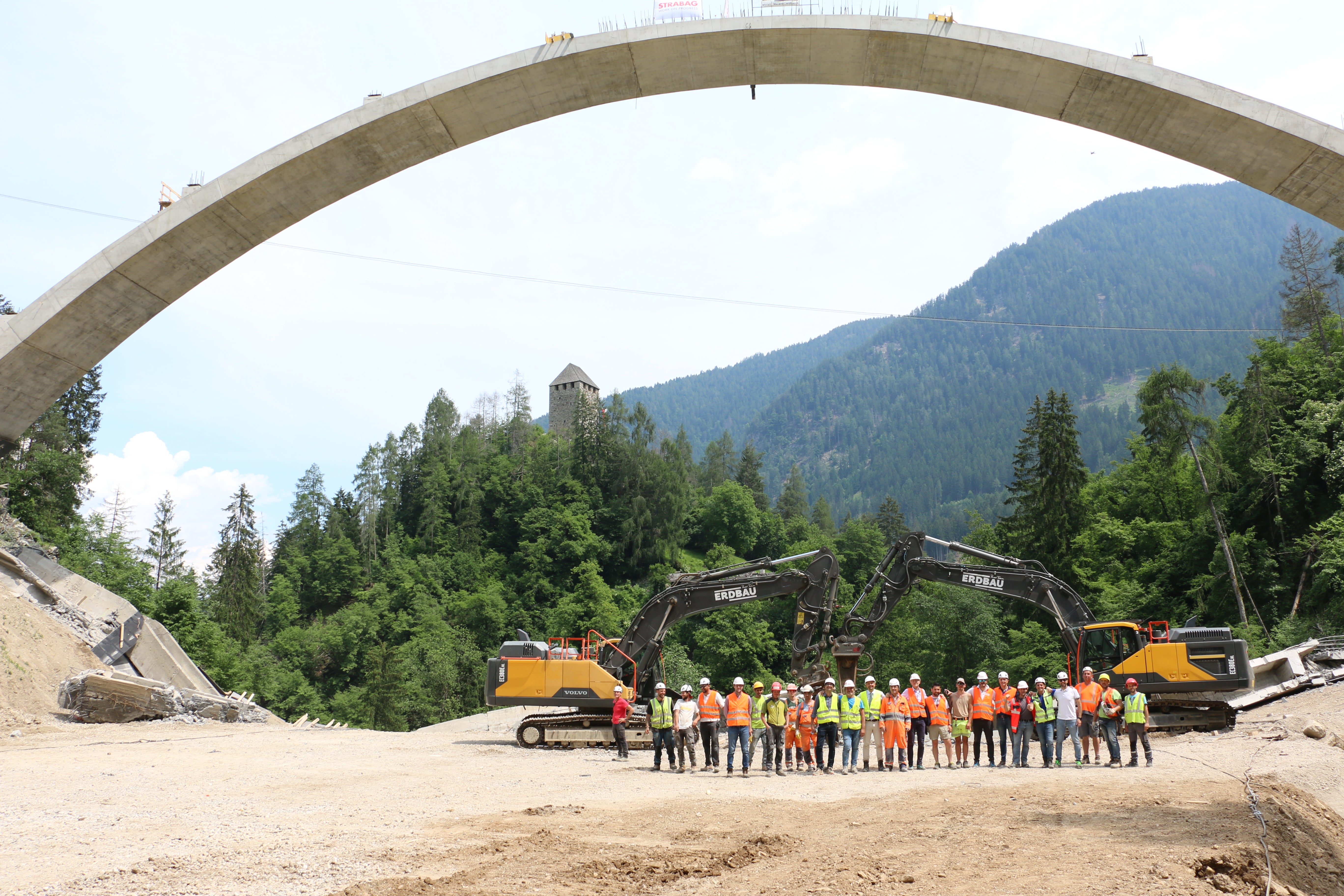 Mit neuer Konstruktionsmethode wird derzeit an der 160 Meter langen Brücke beim Schloss Eschenlohe im Ultental gebaut. Heute (7. Juni) wurde der alte Brückenbogen abgebrochen.
