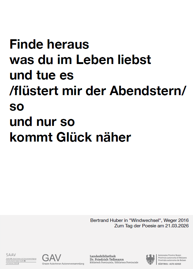 Zum dritten Mal in Folge setzen SAAV und GAV Südtirol mit dieser Aktion ein Zeichen für die Poesie im öffentlichen Raum. Erstmals beteiligt sich die Landesbibliothek Teßmann an dieser Aktion, dadurch wird die Plakataktion erstmals auf die Litfaßsäulen in der Landeshauptstadt ausgeweitet.
