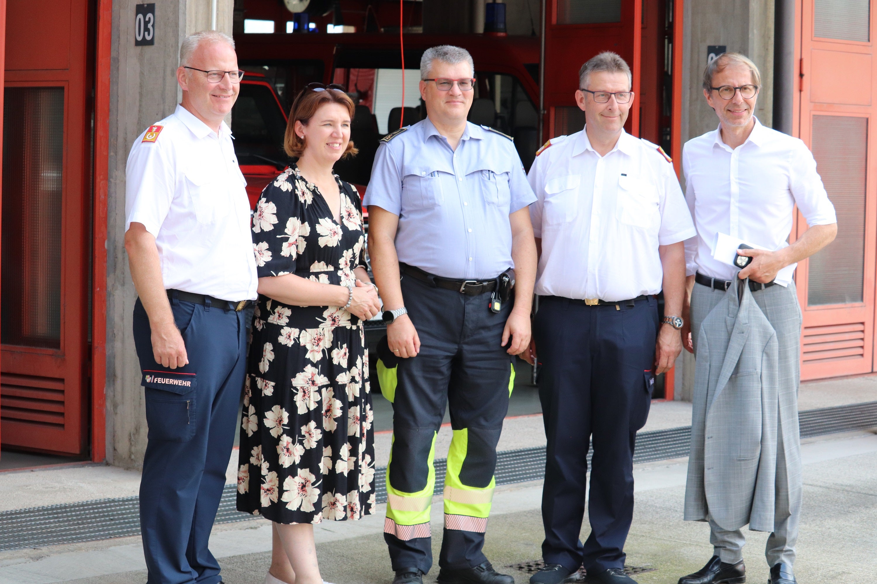 - Gruppenbild zum Abschluss des Besuches (von links): stellvertretender oberösterreichischer Landesfeuerwehrkommandant Michael Hutterer, oberösterreichische Feuerwehr- und Katastrophenschutzlandesrätin Michaela Langer-Weninger, Berufsfeuerwehrkommandant Florian Alber, oberösterreichischer Landesfeuerwehrkommandant und Präsident des Österreichischen Bundesfeuerwehrverbandes Robert Mayer, Direktor der Agentur für Bevölkerungsschutz Klaus Unterweger (Foto: LPA/Maja Clara) » [IMG 1 MB]