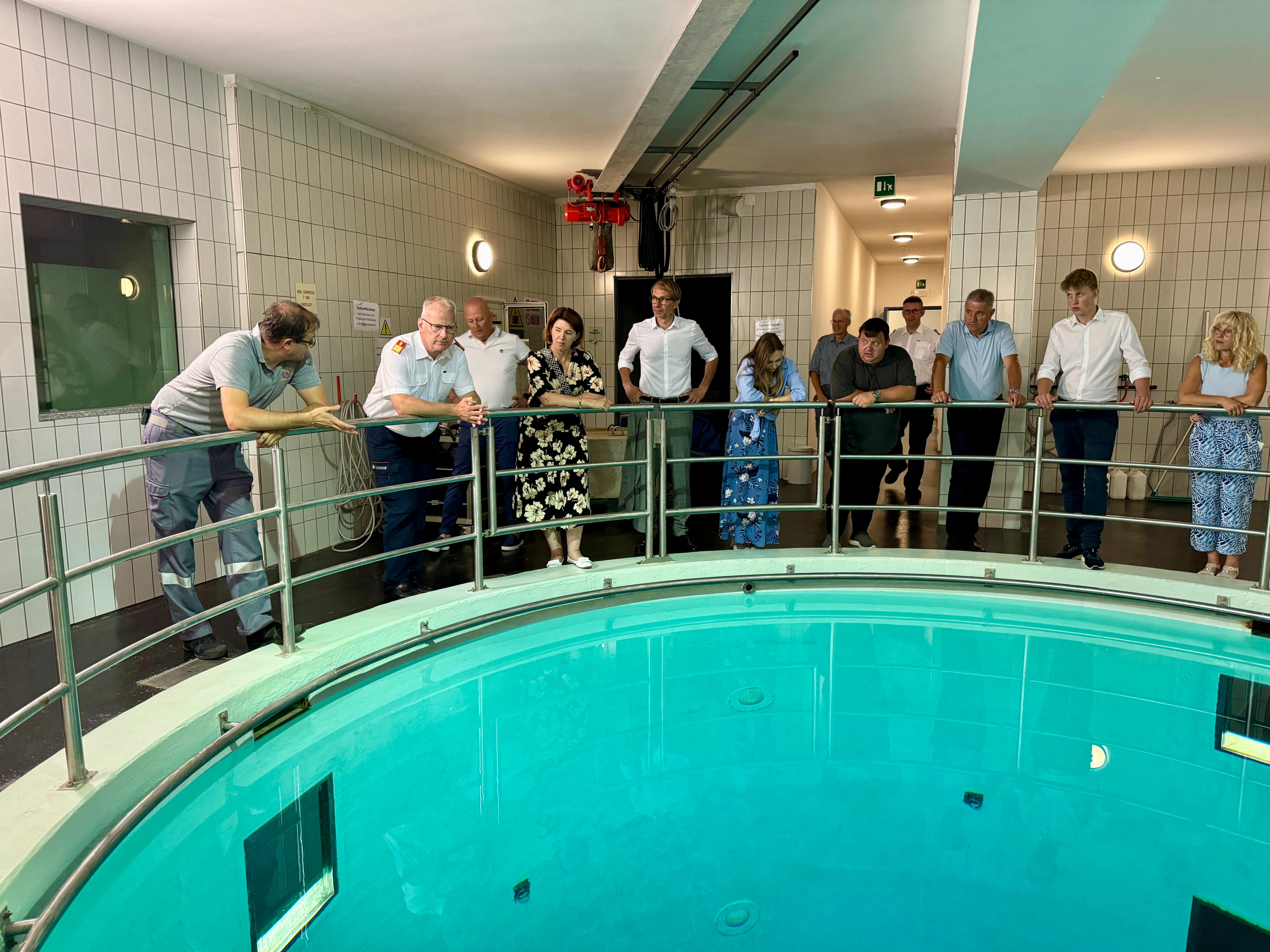 - Landesfeuerwehrschule besichtigt: Die Delegation aus Oberösterreich vor dem zehn Meter tiefen Tauchbecken (Foto: LPA/Landesfeuerwehrverband/Diddi Osele) » [IMG 1 MB]