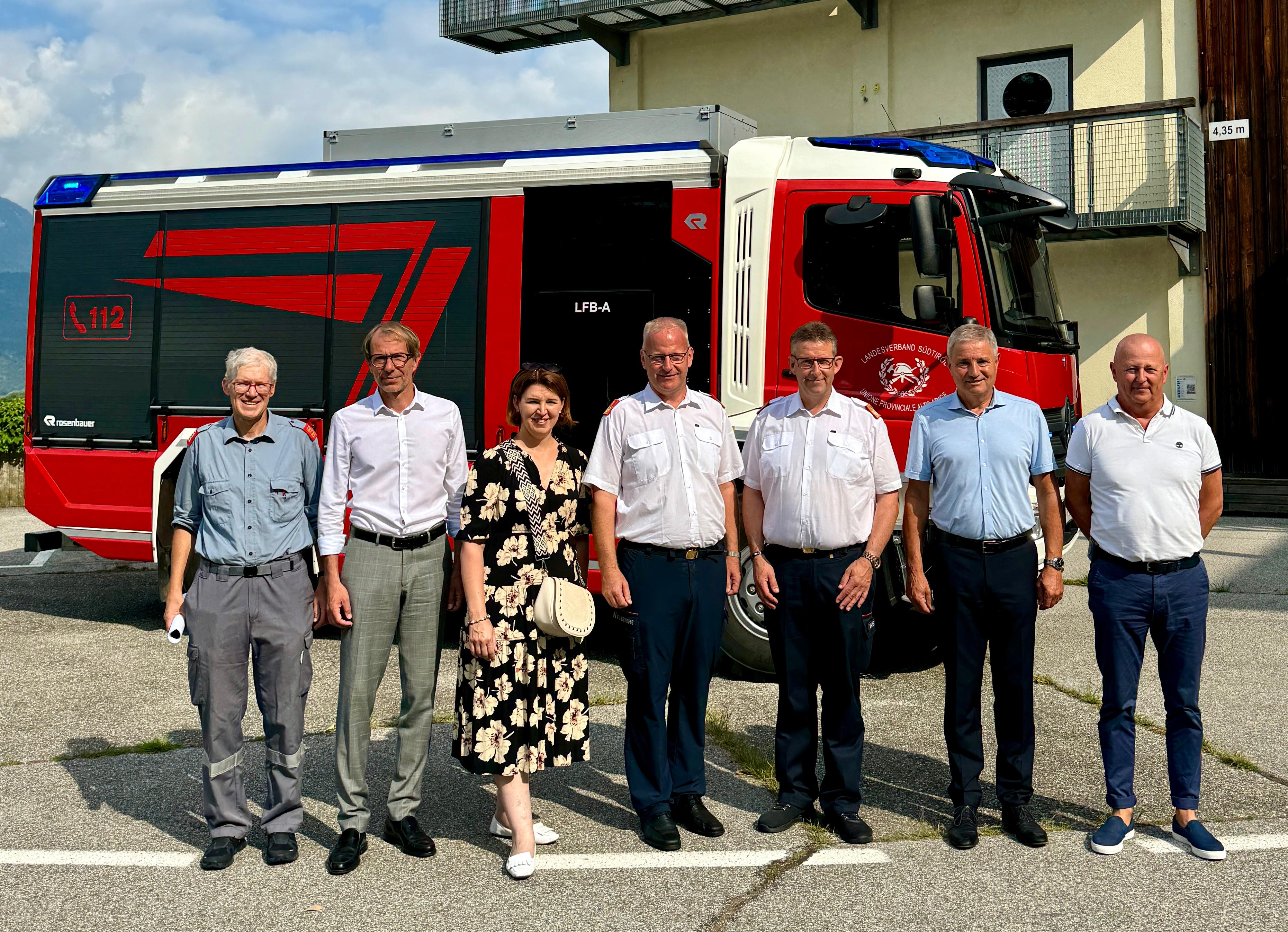 - Besuch der Landesfeuerwehrschule in Vilpian (von links): der Direktor des Landesverbandes der Freiwilligen Feuerwehren Südtirols Christoph Oberhollenzer, der Direktor der Agentur für Bevölkerungsschutz Klaus Unterweger, Landesrätin der Landesregierung Oberösterreichs Michaela Langer-Weninger, der Landeskommandant-Stellvertreter des Landesfeuerwehrverbandes Oberösterreich Michael Hutterer, Bundesfeuerwehr-Präsident und Landeskommandant des Landesfeuerwehrverbandes Oberösterreich Robert Mayer, der Präsident des Landesverbandes der Freiwilligen Feuerwehren Südtirols Wolfram Gapp und Vorstandsmitglied Martin Künig (Foto: LPA/Landesfeuerwehrverband/DiddiOsele) » [IMG 1 MB]