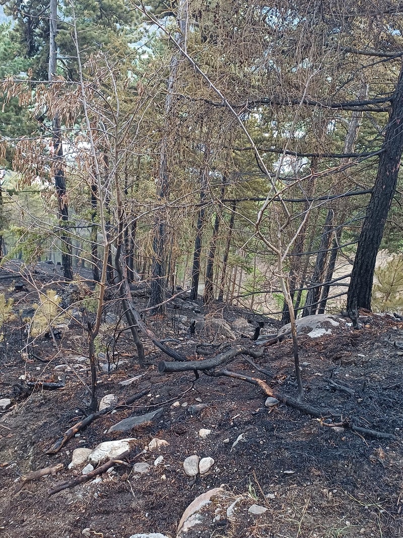 - Der Brand erfasste eine Fläche von etwa einem halben Hektar reinen Schwarzkiefernwald, mit einer Ausdehnung von rund 40 mal 150 Metern. (Foto: LPA/Forstinspektorat Schlanders) » [IMG 1 MB]