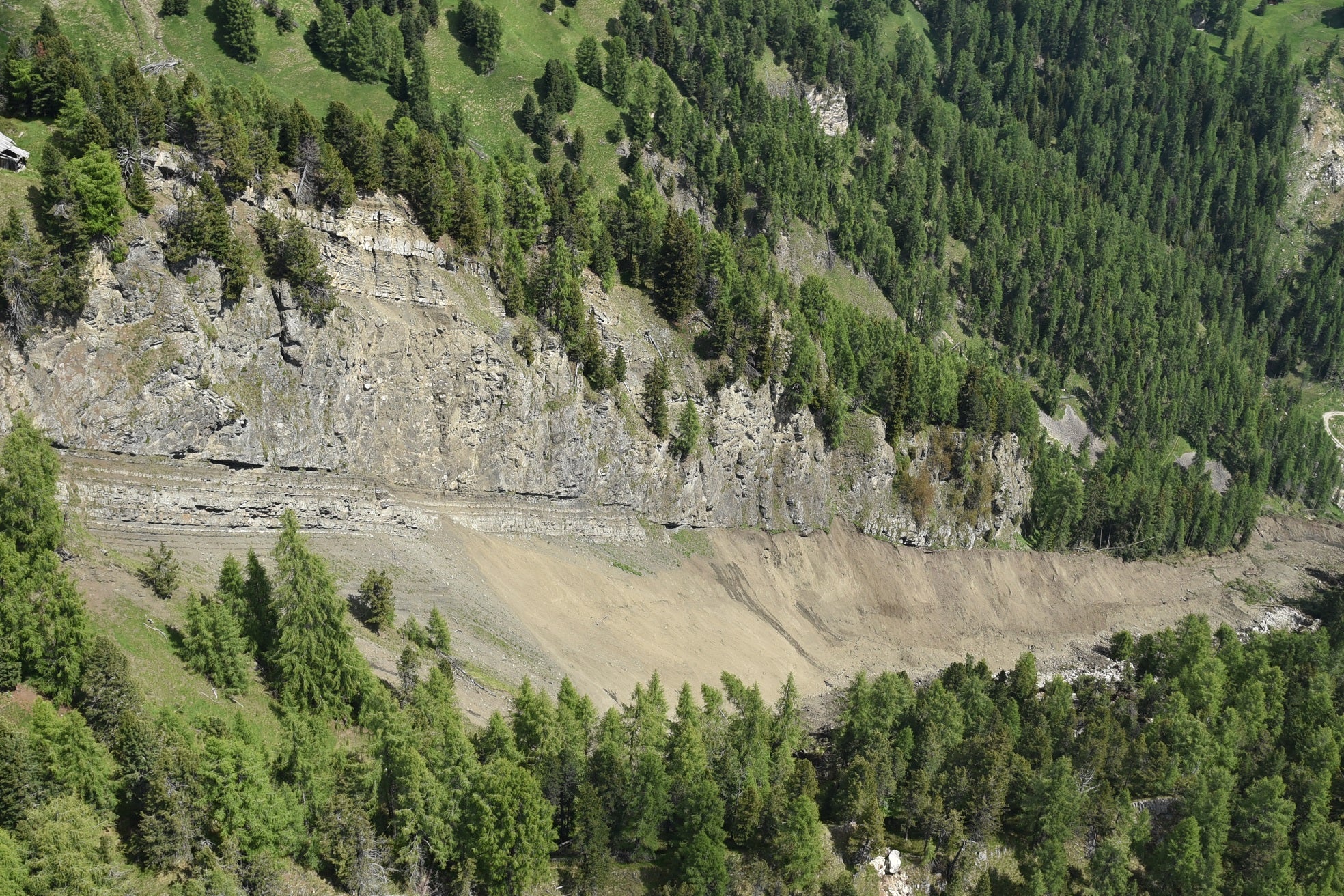 - Gestern um 8 Uhr wurde Alarm gegeben, im Bild die Abbruchstelle der Mure (Foto: LPA/Landeswarnzentrum in der Agentur für Bevölkerungsschutz/Omar Formaggioni) » [IMG 1 MB]