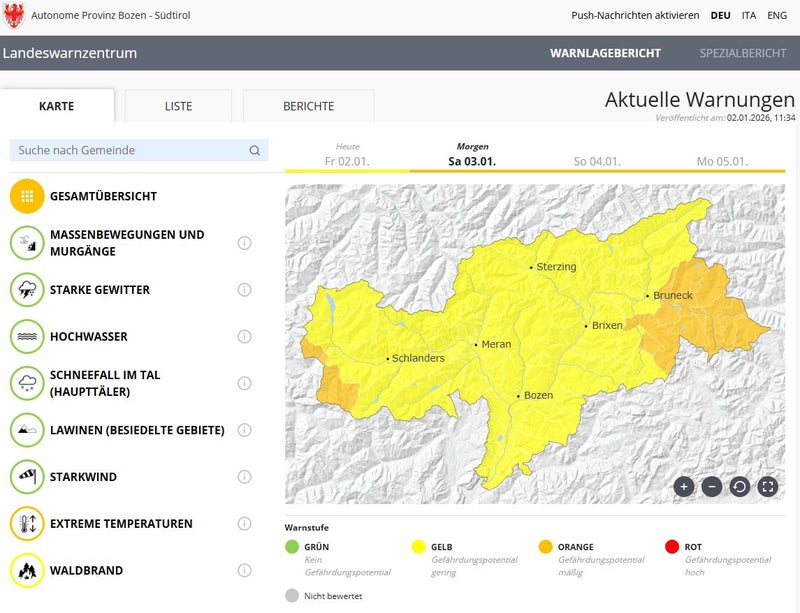 Der Warnlagebericht wird täglich vom Landeswarnzentrum veröffentlicht. Informationen zur Verkehrssituation gibt es laufend aktualisiert auf den Seiten der Landesverkehrsmeldezentrale und auf www.suedtirolmobil.info. Stets aktuelle Online-Informationen gibt es zudem zur Wetterlage und zur Lawinensituation.