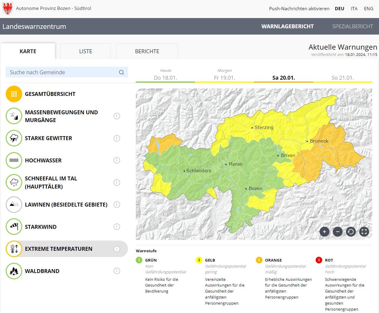 Der Warnlagebericht wird täglich vom Landeswarnzentrum veröffentlicht. Informationen zur Verkehrssituation gibt es laufend aktualisiert auf den Seiten der Landesverkehrsmeldezentrale und auf www.suedtirolmobil.info. Stets aktuelle Online-Informationen gibt es zudem zur Wetterlage und zur Lawinensituation.