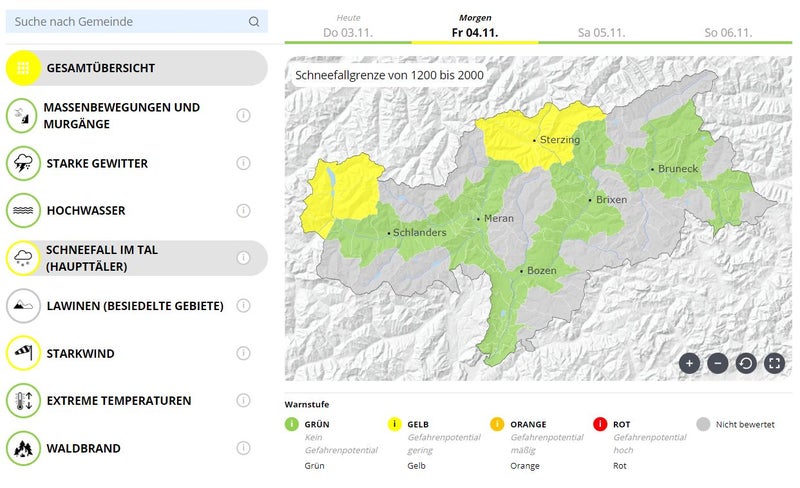Langsam stellt sich das Wetter um, es überwiegen die Wolken, es regnet schon leicht, wie beim heutigen (3. November) Meteo-Briefing im Landeswarnzentrum in der Agentur für Bevölkerungsschutz zusammengefasst wurde: In der Nacht erreicht uns von Süden her eine Störung, der Regen breitet sich auf das ganze Land aus. Mit einem Mittelmeertief vom Süden und einer Kaltfront vom Norden ist mit sinkender Schneefallgrenze zu rechnen, im Norden Südtirols wird es weiter herunterschneien, im Süden bis auf 1500 Meter. Im Großteil des Landes werden 20 bis 40 Liter Niederschlag pro Quadratmeter erwartet, stellenweise auch über 40. Morgen im Laufe des Nachmittags werden die Niederschläge vom Westen her weniger, es wird föhnig, die Niederschläge lassen langsam nach, mit dem Wochenende kommt wieder eine Wetterbesserung.