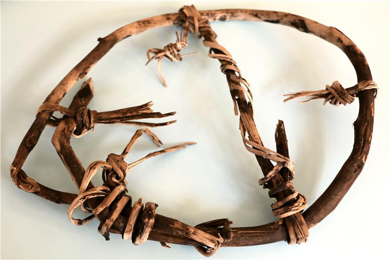 La ciaspola, interamente di legno di betulla, fu realizzata piegando un ramo a sezione circolare lungo circa 1,5 m (diametro 32 cm); all’interno furono tesi alcuni tiranti.