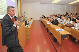 Karlheinz Steinmüller, futurologo e cofondatore della Z_punkt GmbH The Foresight Company ha quindi illustrato la sua relazione sul tema “Cosa vuol dire guardare nel futuro? Cambiamenti sociali e tecnologici imprevedibili: uno sguardo al passato per imparare a gestire meglio il futuro”. Secondo il relatore non è possibile fare semplicemente una proiezione nel futuro della situazione attuale ma vi sono molti fattori già oggi presenti che sono in grado di influenzare in maniera considerevole il nostro futuro.