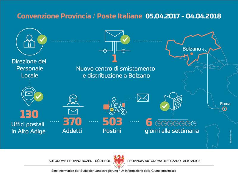 Per quanto riguarda il personale, oltre al mantenimento dei 503 postini e 370 addetti negli uffici postali, da segnalare le 15 nuove assunzioni legate proprio al centro di distribuzione, e la copertura dei posti apicali con gli altoatesini Luca Passero (direttore provinciale) ed Ester Demetz (direttrice del personale) a garanzia di una migliore attenzione a necessità, bisogni ed esigenze del territorio. "Questa operazione - aggiunge Kompatscher - è resa possibile grazie all'accordo di Milano, con la Provincia che concorre agli obiettivi di risanamento del debito pubblico nazionale facendosi carico di una serie di oneri che garantiscono un migliore servizio". Per quanto riguarda il personale, infine, sono previste ulteriori assunzioni: il tema sarà discusso dalla commissione paritetica Provincia-Poste Italiane, anche perchè, alla luce della sostanziale piena occupazione presente in Alto Adige, le forme contrattuali precarie o le assunzioni a tempo determinato rischiano di non avere il necessario riscontro da parte dei potenziali nuovi lavoratori.