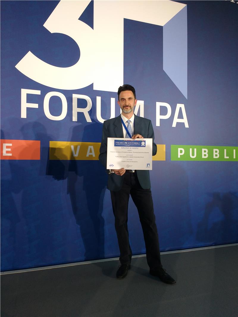Promosso dal Forum Pubblica Amministrazione in collaborazione con l’alleanza italiana per lo sviluppo sostenibile, il "Premio PA Sostenibile” ha lo scopo di selezionare i migliori progetti nazionali che puntano a raggiungere gli obiettivi di sviluppo sostenibile secondo quanto previsto dall'Agenda 2030 dell'ONU. Il progetto della Sovrintendenza scolastica italiana denominato FUSS – Free Upgrade for a digitally Sustainable School (https://fuss.bz.it), che concorreva nella categoria "Capitale umano ed educazione", è stato recentemente premiat a Roma sulla base di 4 criteri predefiniti dalla giuria: innovatività, trasferibilità, rilevanza, sostenibilità organizzativa ed economica. “Questi – spiega Paolo Dongilli, coordinatore – sono, infatti, i punti di forza di FUSS. E’ un progetto di sostenibilità digitale per la scuola e nel contempo un prodotto free software per la gestione a 360 gradi di una rete scolastica”. Per organizzazione e struttura FUSS rappresenta un'esperienza unica non solo in Italia ma anche in Europa. Il progetto ha portato alla migrazione verso software libero degli strumenti informatici utilizzati nella didattica di tutte le scuole in lingua italiana dell'Alto Adige: ad oggi lo usano 1.800 docenti e 16.000 studenti; è installato su 4.000 PC e 60 server in circa 80 scuole della Provincia Autonoma di Bolzano) alle quali si aggiungono il Liceo paritario delle scienze applicate allo sport Toniolo ed il Laboratorio di robotica educativa presso Liceo scientifico delle scienze applicate presso l’istituto paritario Rainerum di Bolzano, la Scuola di Musica in lingua italiana Vivaldi, il Liceo statale Niccolò Rodolico di Firenze e l’Istituto Professionale Cornaro per i servizi di enogastronomia e ospitalità alberghiera di Jesolo. FUSS è coordinato e finanziato dalla Direzione istruzione e formazione italiana della Provincia di Bolzano e, continua Dongilli, “ha permesso di rendere digitalmente sostenibile la didattica nelle scuole italiane grazie a quattro obiettivi fondamentali: l’utilizzo di software libero, l’impiego di formati aperti, la creazione di contenuti liberi ponendo così le basi per il quarto obiettivo il cui raggiungimento dovrebbe essere garantito da ogni scuola per definizione: il libero accesso al sapere”.