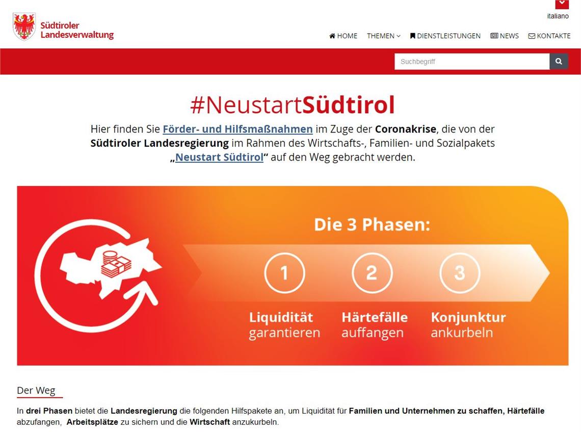 La Provincia dal canto suo finanzierà ulteriori misure per famiglie e associazioni nell'ambito del programma #AltoAdigesiriparte. Tutte le iniziative a vantaggio di cittadini e imprese saranno consultabili nei prossimi giorni all'interno di un portale web dedicato che raccoglierà tutti gli aiuti attivati dalla Provincia e dallo Stato. A partire dalla prossima settimana il catalogo degli aiuti sarà consultabile all'indirizzo siriparte.provincia.bz.it.