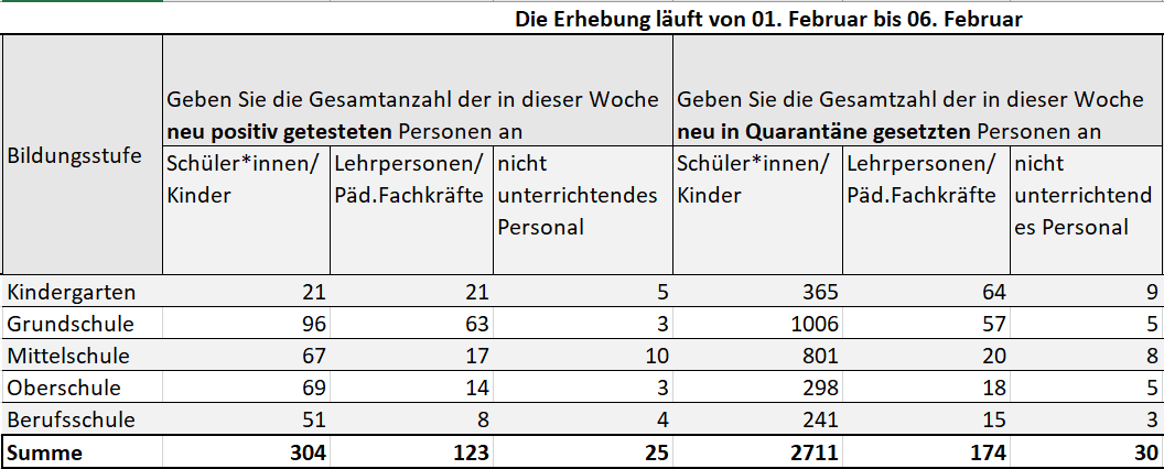 Nella settimana, tra l'1 e il 6 febbraio sono state registrate 452 nuove infezioni da Covid-19 nelle scuole in lingua tedesca dell'Alto Adige. Un numero in calo rispetto alla settimana precedente, durante la quale la cifra complessiva aveva raggiunto 461 casi di positività. In crescita il numero delle persone collocate in quarantena, 2915, rispetto alle 2501 della settimana precedente. I numeri resi noti settimanalmente dalla Direzione istruzione e formazione tedesca includono l'intero corpo docente, il personale non insegnante, nonché bambini e ragazzi dalla scuola dell’infanzia alle scuole superiori.