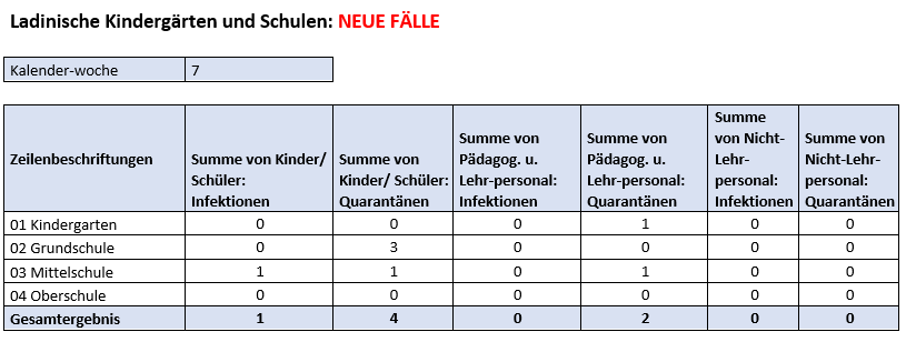 Un solo caso di positività al Covid-19 è stato riscontrato la scorsa settimana, tra il 15 e il 20 febbraio, nelle scuole in lingua ladina dell'Alto Adige. Un dato in netto calo rispetto alle 12 segnalazioni registrate la settimana precedente. Lo rende noto l'Intendenza scolastica ladina. I dati comprendono tutta la comunità scolastica, dalle scuole dell'infanzia alle scuole secondarie di secondo grado, ovvero bambini, alunni, studenti, collaboratrici pedagogiche, personale insegnante e personale non insegnante.