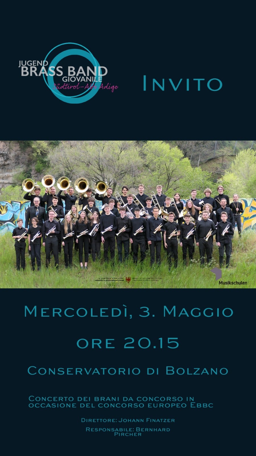 Il concerto di mercoledì 3 maggio è la prova generale pubblica. La Brass Band Giovanile Alto Adige, diretta da Johann Finatzer, sarà sul palco insieme alla Brass Band Oltradige, che parteciperà a sua volta all'EBBC (European Brass Band Contest) di Malmö.