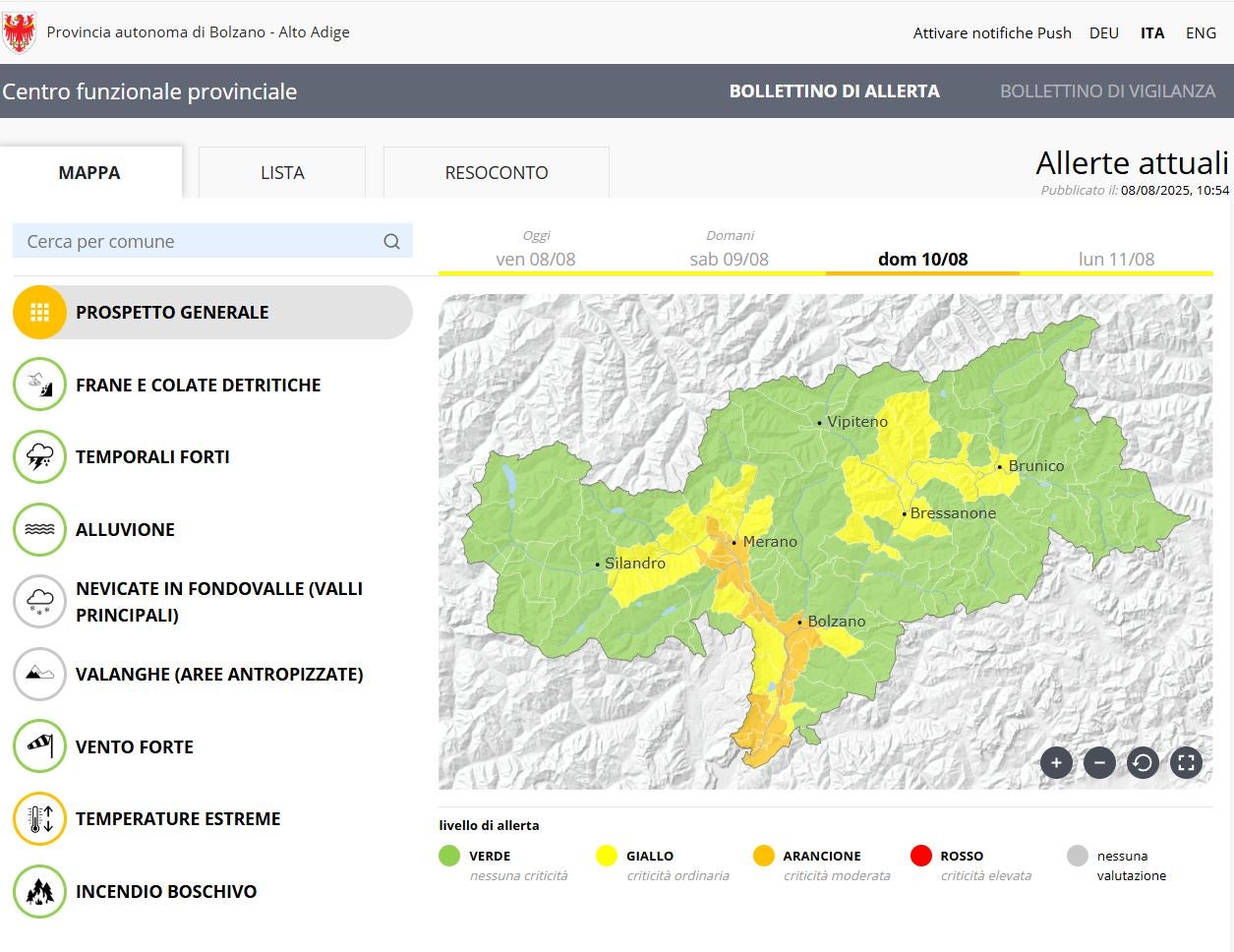 Il bollettino di allerta del Centro funzionale provinciale fornisce informazioni sul potenziale pericolo di eventi naturali in Alto Adige. Informazioni sulla situazione meteo generale in Alto Adige: Meteo | Meteo | Provincia autonoma di Bolzano - Alto Adige.