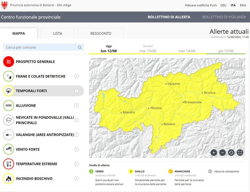Il bollettino di allerta del Centro funzionale provinciale fornisce informazioni sul potenziale pericolo di eventi naturali in Alto Adige.