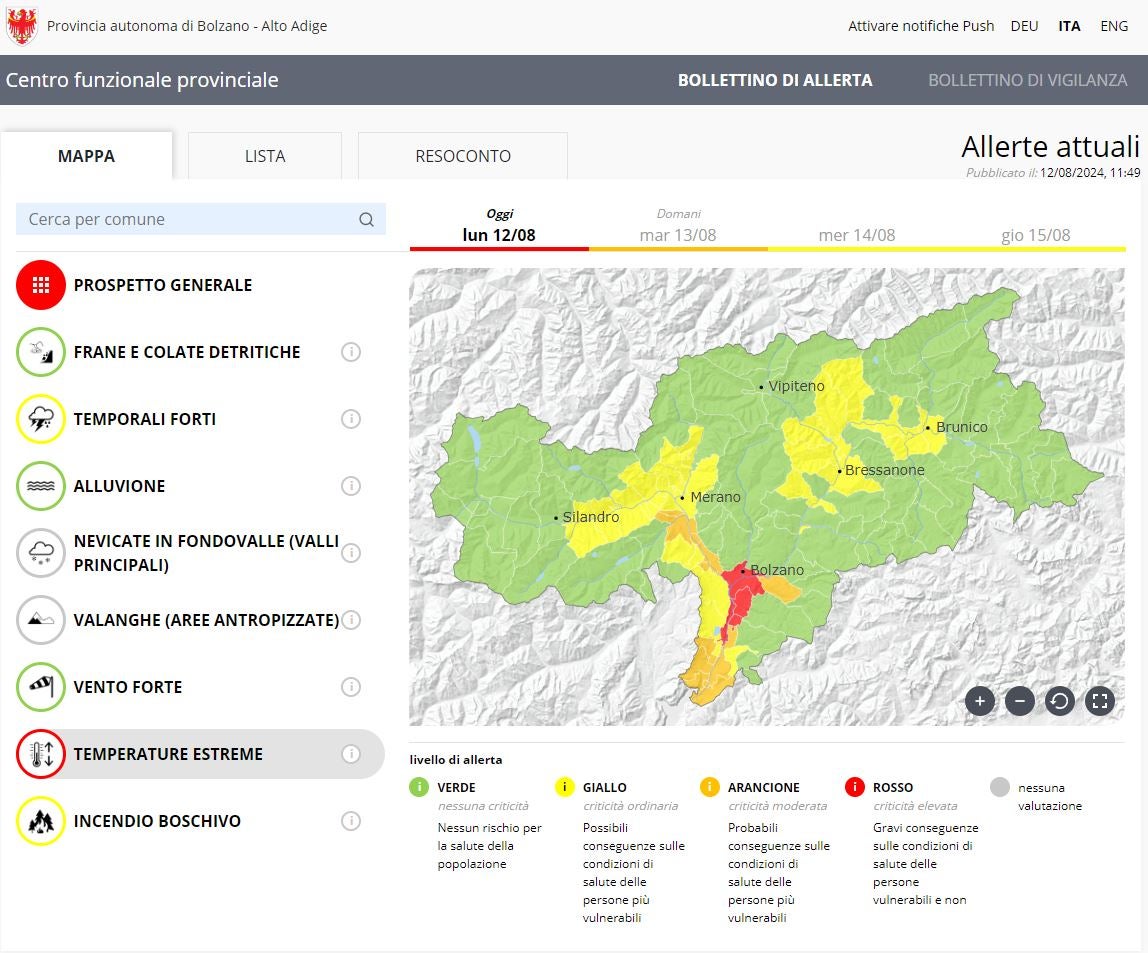 Caldo torrido: livello di allerta rosso in quattro Comuni altoatesini
