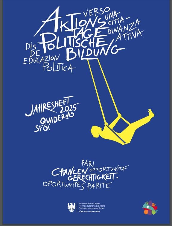BOLZANO (USP). Un programma ricco, con 40 eventi e iniziative in 20 località diverse in tutto l'Alto Adige: questo è il bilancio delle Giornate di cittadinanza attiva 2025. Il Quaderno annuale di cittadinanza attiva 2025: "Pari opportunità" offre una retrospettiva e una panoramica dell'iniziativa. Quest'anno le giornate di azione si sono svolte all'insegna dell'anniversario delle guerre contadine e hanno quindi avuto come tema centrale le pari opportunità. L'opuscolo documenta la varietà delle attività realizzate, dai workshop e tavole rotonde ai progetti partecipativi. Queste sono state realizzate da istituti di formazione, comitati educativi, scuole, associazioni e istituzioni. Allo stesso tempo, l'opuscolo può anche servire come piccolo kit di metodi e idee per realizzare eventi di educazione civica a livello locale.