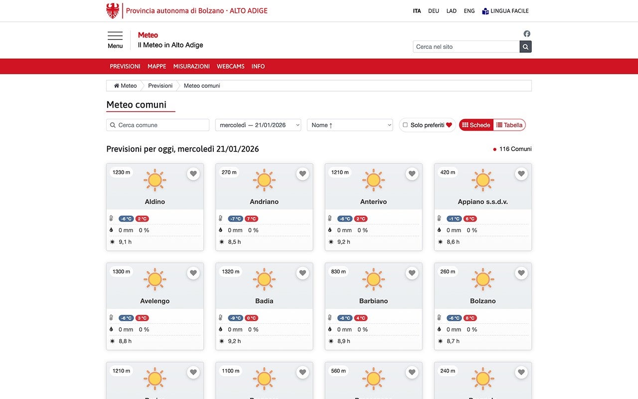 I meteorologi dell'Ufficio provinciale Meteorologia e prevenzione valanghe sottolineano le novità più importanti della pagina dedicata alle previsioni meteorologiche: la pagina ha ora un design moderno e una migliore guida per l'utente, è stata ridisegnata dal punto di vista visivo e tecnico per garantire una navigazione intuitiva e una rapida accessibilità, sia su desktop che su dispositivi mobili. Anche le dettagliate previsioni meteorologiche comunali sono ora online e disponibili direttamente sul sito web, invece che solo nell'app come in precedenza.