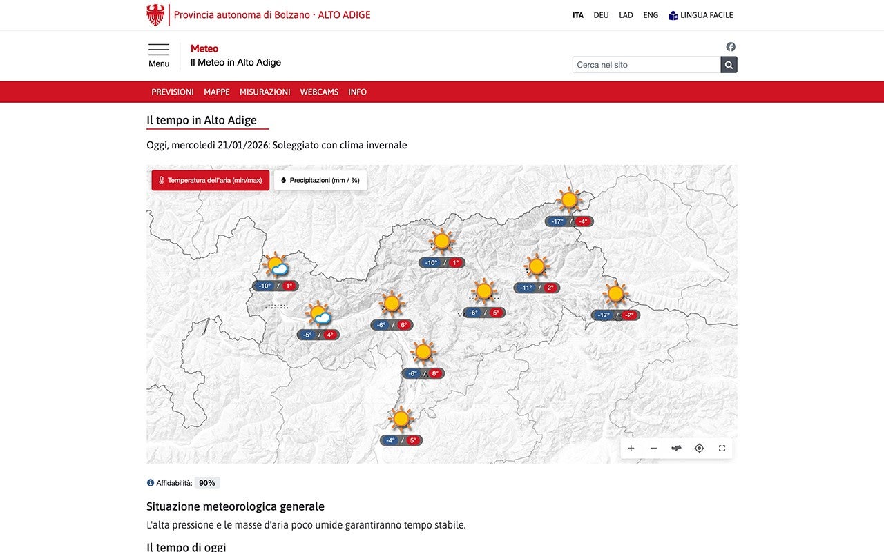 BOLZANO (USP). Interattivo e dinamico: così si presenta dal 21 gennaio il portale meteo dell'Ufficio Meteorologia e prevenzione valanghe. Informatica Alto Adige SpA (IAA) ha completamente rinnovato il portale meteo in collaborazione con l'Ufficio Meteorologia e prevenzione valanghe. Il numero di accessi al portale web della Provincia dedicato al meteo è di gran lunga il più alto: lo scorso anno la pagina meteo è stata visitata oltre 70 milioni di volte, con quasi 30 milioni di visite.