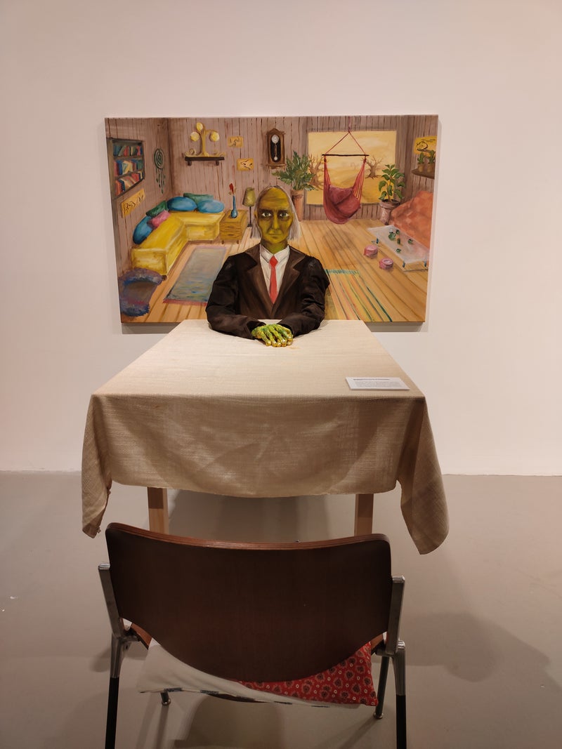 - L'opera “Ein Aufeinandertreffen im Wohnzimmer” di Klara Meßner, olio su tela e argilla. (Foto: USP/Direzione Istruzione, formazione e cultura ladina) » [IMG 2 MB]