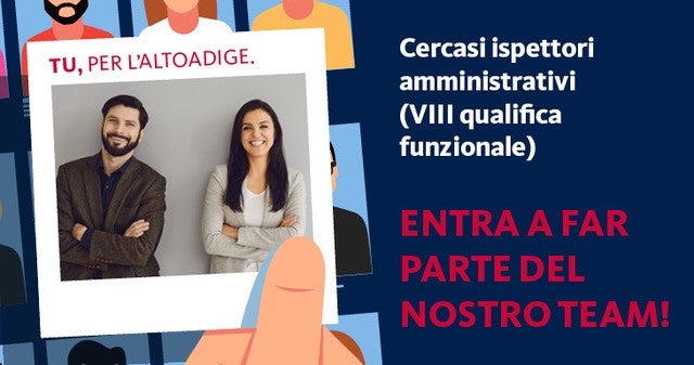 L’Ufficio Assunzioni personale della Provincia ha indetto un concorso pubblico per l’assunzione a tempo indeterminato di 5 ispettori amministrativi per gli uffici amministrativi. Ai candidati è richiesto l'adempimento di studi universitari almeno quadriennali (VIII qualifica funzionale). Tra gli altri requisiti d'accesso è necessario essere in possesso del patentino di bilinguismo C1 (ex patentino A) e dell'esame di ladino C1 per le persone ladine.
