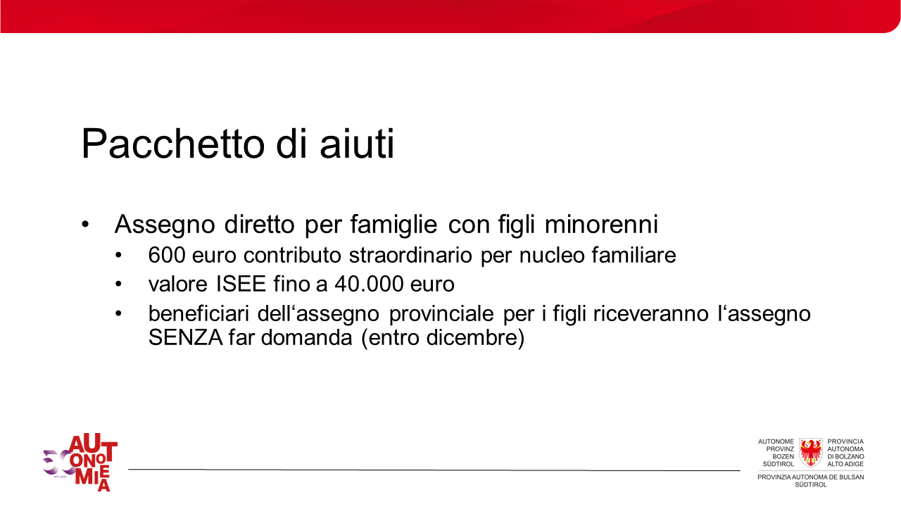 Nello specifico, oggi è stato confermato che le prestazioni di sostegno sono due: da un lato, le famiglie con figli minorenni ricevono un contributo di 600 euro. È a disposizione di tutte le famiglie beneficiarie che non superano un valore ISEE di 40.000 euro e che hanno diritto all'assegno provinciale per i figli. Chi già percepisce l'assegno non deve presentare un’ulteriore domanda. La prestazione verrà erogata a dicembre tramite l'Agenzia per lo sviluppo sociale ed economico (ASSE). Chi non percepisce ancora la prestazione provinciale per i figli può richiederla in qualsiasi momento online o tramite un Patronato fino alla fine di dicembre 2022. Si prevede che circa 34.000 famiglie in Alto Adige riceveranno questa prestazione una tantum dalla Provincia.