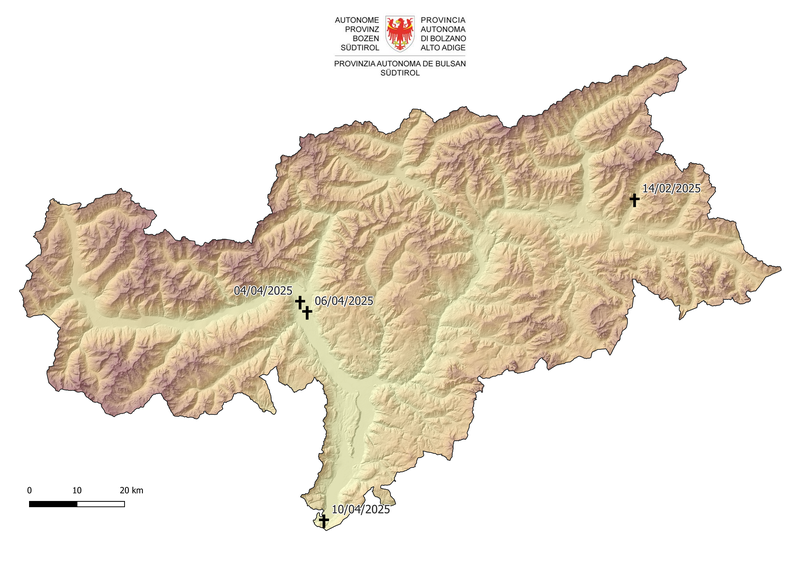 - In Alto Adige, dall'inizio di quest'anno sono stati recuperati quattro lupi morti in seguito ad uno scontro con un'auto. I luoghi di ritrovamento sono contrassegnati da crocette. (Foto: USP/Ufficio provinciale Gestione fauna selvatica) » [IMG 3 MB]