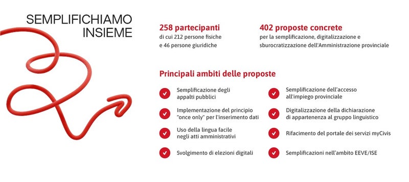 Le proposte ricevute coprono un'ampia gamma di argomenti: dalle semplificazioni nelle procedure di appalto pubblico all'attuazione del principio "once only" ("una sola volta") per l'inserimento dei dati e all'uso di un linguaggio semplice nelle pratiche amministrative. Sono state spesso suggerite anche l'organizzazione di elezioni in via digitale, la semplificazione dell'accesso alla funzione pubblica, la digitalizzazione della dichiarazione di appartenenza al gruppo linguistico, la riprogettazione del portale dei servizi myCivis e semplificazioni in materia di DURP/ISEE.